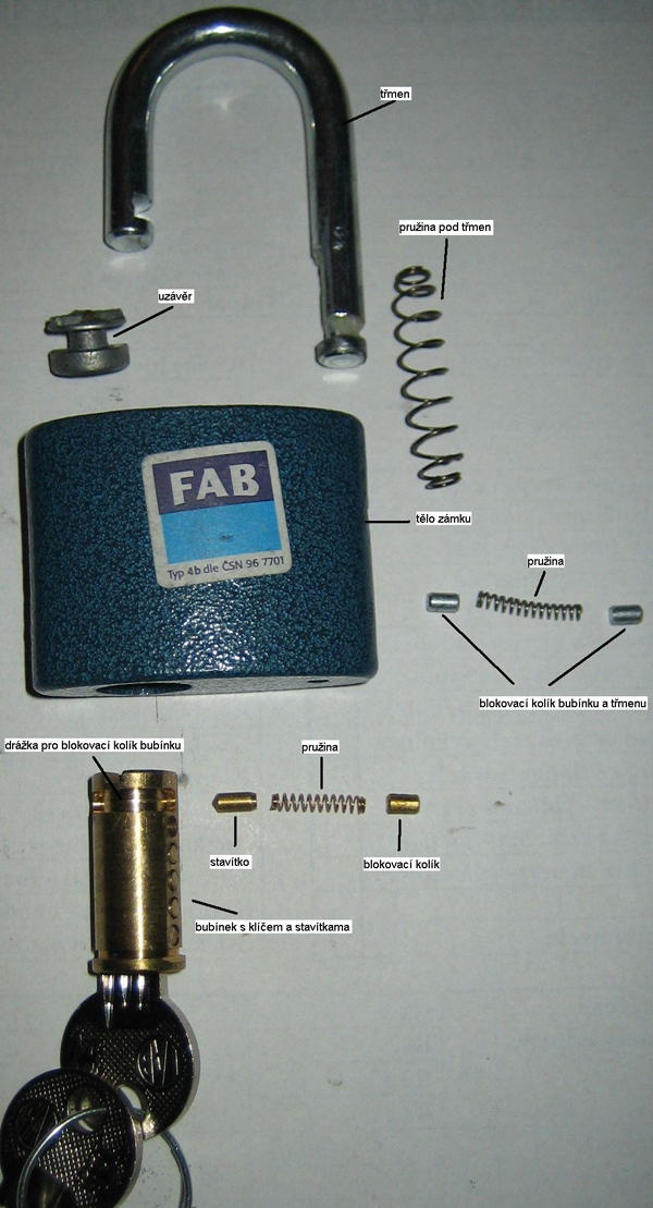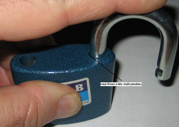 fisa nm odeslal(a) nsledujc lnek: "Tento zámek se rozebere za pomocí originálního neupraveného klíče. Takže, odemkneme zámek klíčem a necháme třmen v odemčené poloze. Následně bubínek přetočíme do zamčeného stavu. Takto odemčený zámek postavíme na stůl a zatlačíme třmen až na doraz. Pak otočíme třmen o cca 180 stupňů ( třmen je pořád zatlačen )...